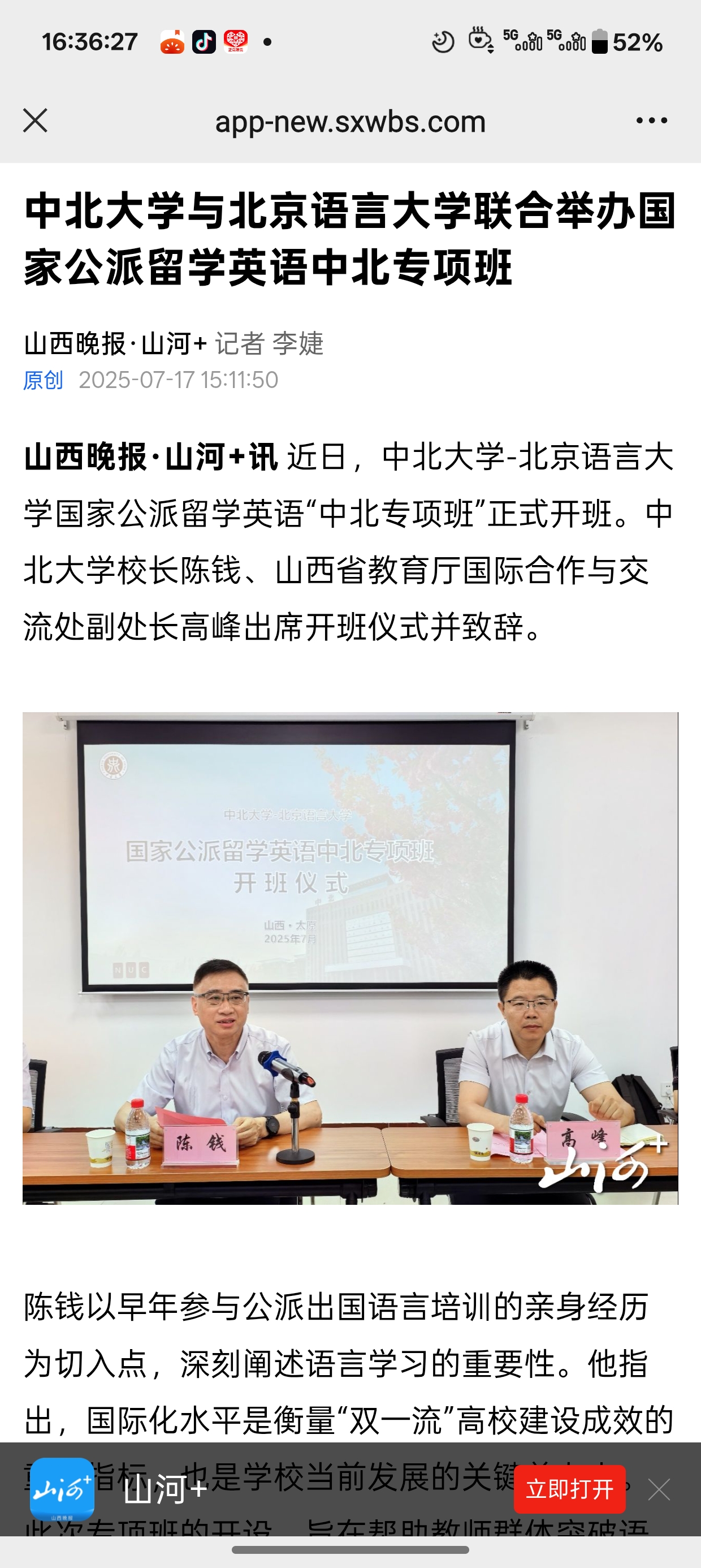 【山西晚报】中北大学与北京语言大学联合举办国家公派留学英语中北专项班