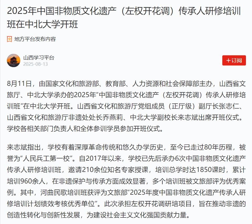 【学习强国】2025年中国非物质文化遗产(左权开花调)传承人研修培训班在中北大学开班