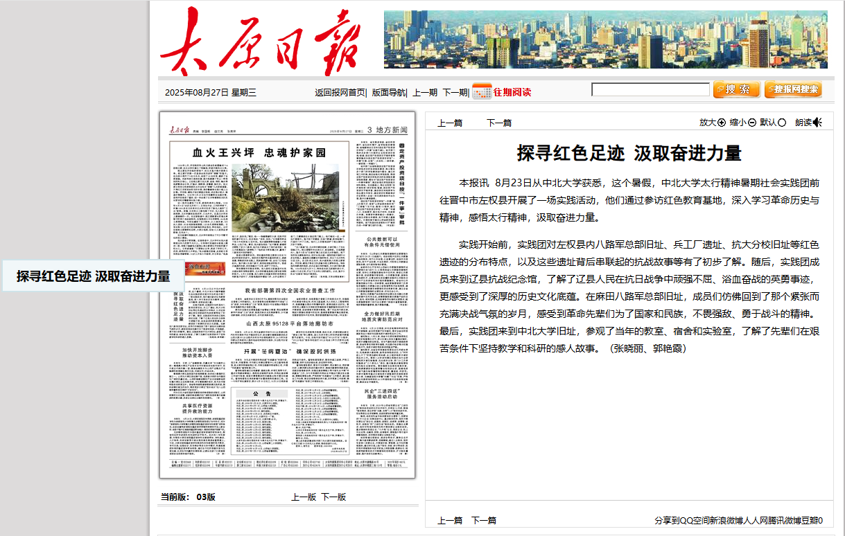 本报讯 8月23日从中北大学获悉,这个暑假,中北大学太行精神暑期社会实践团前往晋中市左权县开展了一场实践活动,他们通过参访红色教育基地,深入学习革命历史与精神,感悟太行精神,汲取奋进力量。