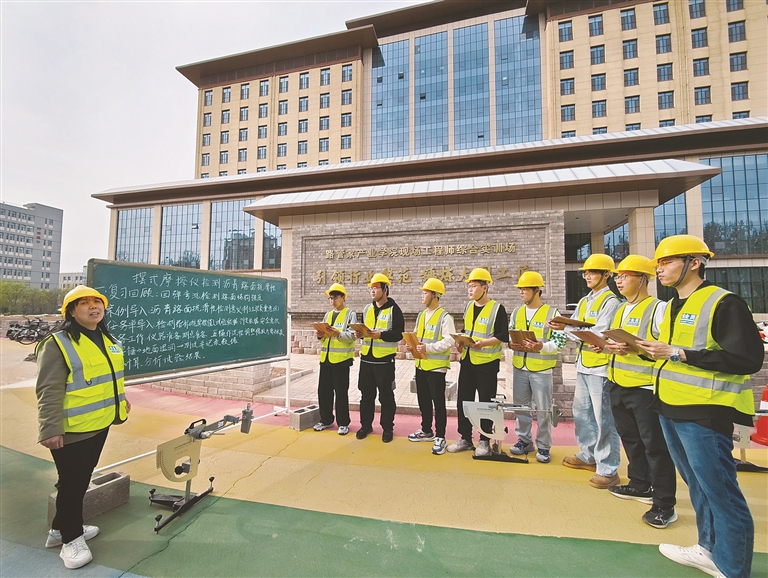 图④:山西工程科技职业大学现场工程师综合实训基地,学生们正在利用摆式摩擦仪检测沥青路面抗滑性。