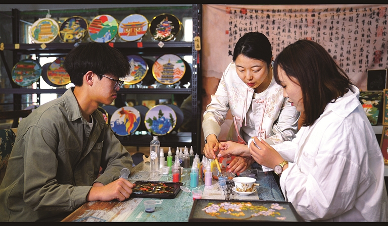 山西工商学院将非遗技艺、文化内涵融入教学实践。图为学生在体验掐丝珐琅非遗技艺。本报通讯员摄