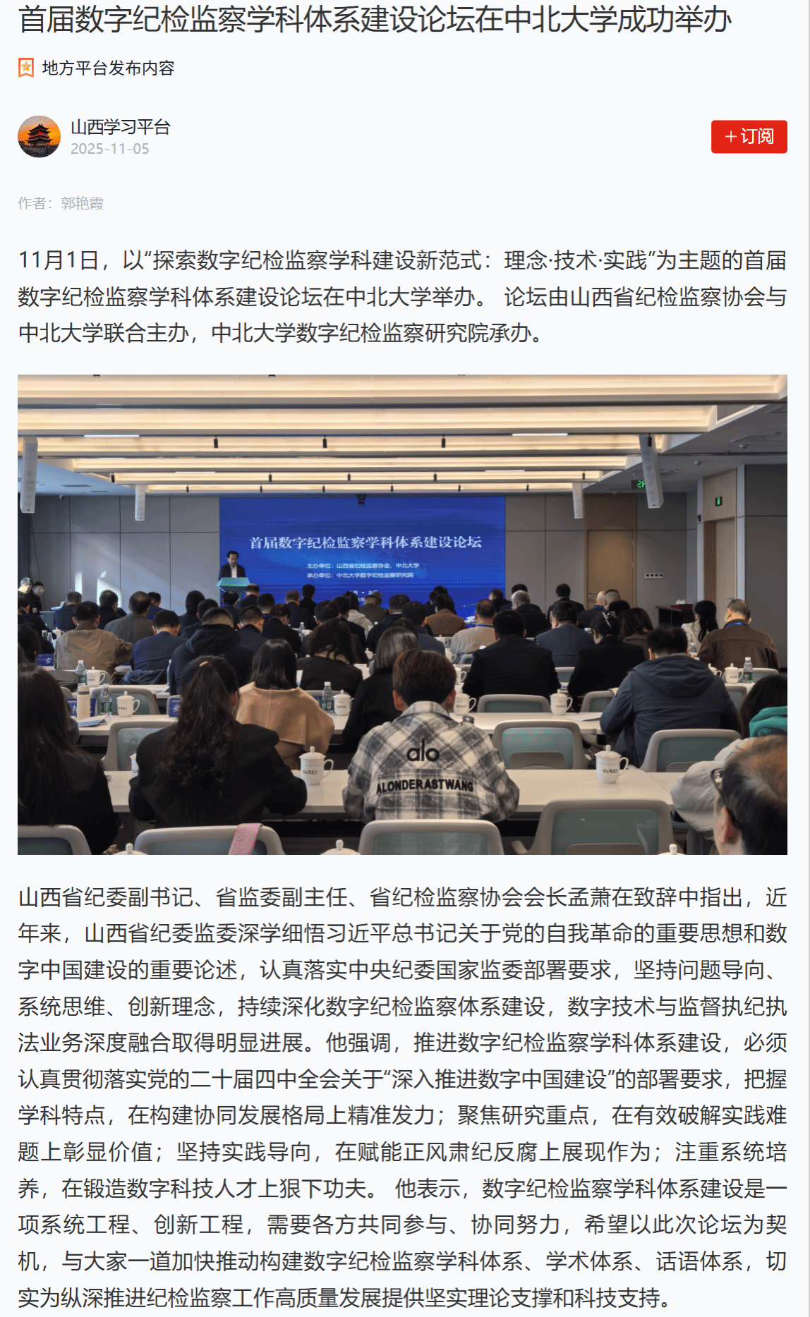 11月1日,以“探索数字纪检监察学科建设新范式:理念·技术·实践”为主题的首届数字纪检监察学科体系建设论坛在中北大学举办。论坛由山西省纪检监察协会与中北大学联合主办,中北大学数字纪检监察研究院承办。