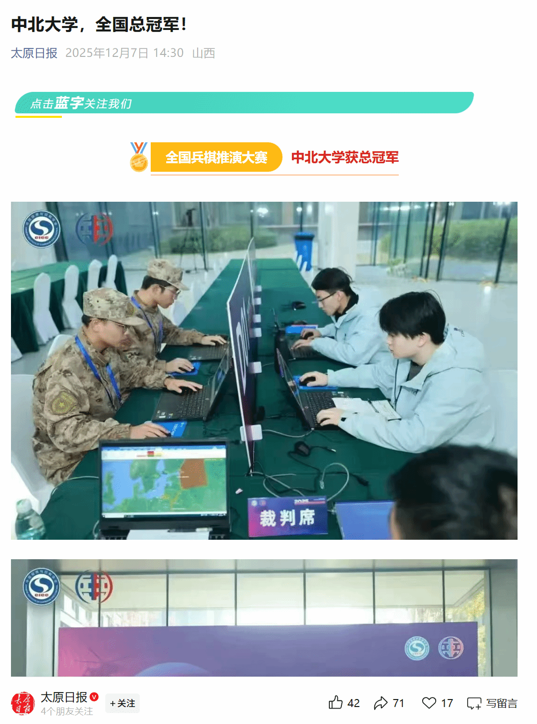 12月5日,第九届全国兵棋推演大赛总决赛在苏州圆满收官。作为国防育人特色的高校,中北大学在关键对决中展现强劲实力,以亮眼成绩成功斩获“人人对抗主体赛”总冠军。同时,中北大学学子还包揽国家一等奖7项、二等奖2项、三等奖1项,总计11项国家级奖项,成为本届大赛获奖数量最多的高校。