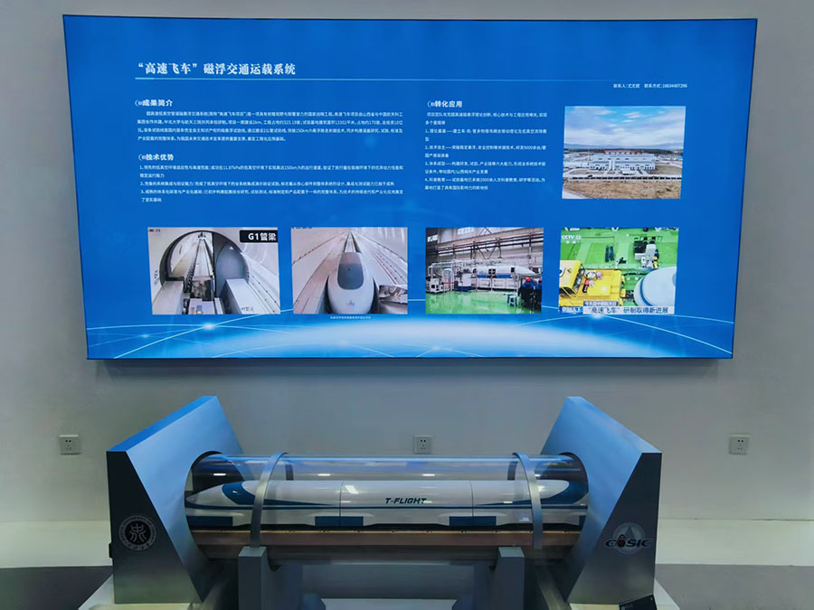 在中北大学的科技成果展览馆,记者看到有高端仪器、人工智能、新能源、低空经济等各领域技术成果,其中位于展厅的高速飞车模型尤其引人注目。据中北大学科研院副院长赵小龙介绍,“高速飞车项目”是中北大学与航天三院共同承担研制,该条试验线是国内首条完全自主知识产权的磁悬浮试验线,通过建设2公里试验线,突破 150km/h 悬浮推进关键技术, 为我国未来交通技术变革提供重要支撑,奠定工程化应用基础。