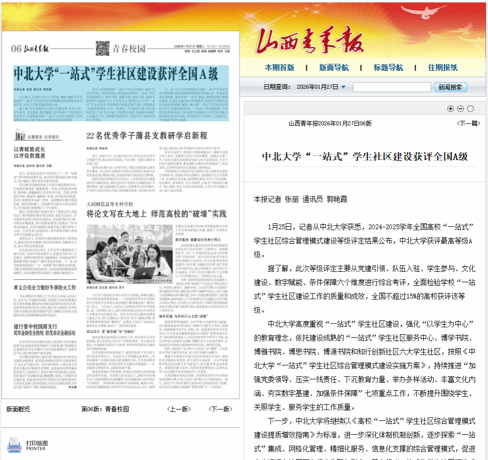 【山西青年报】中北大学“一站式”学生社区建设获评全国A级