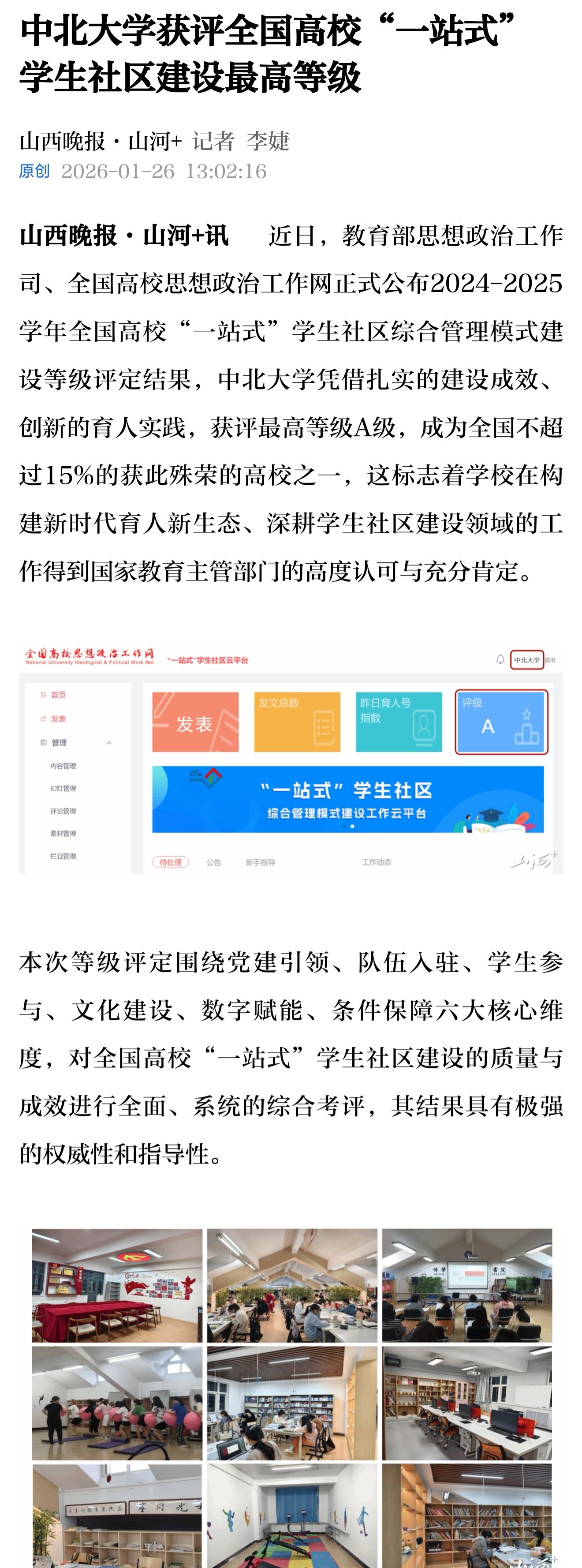 山西晚报·山河+讯 近日,教育部思想政治工作司、全国高校思想政治工作网正式公布2024-2025学年全国高校“一站式”学生社区综合管理模式建设等级评定结果,中北大学凭借扎实的建设成效、创新的育人实践,获评最高等级A级,成为全国不超过15%的获此殊荣的高校之一,这标志着学校在构建新时代育人新生态、深耕学生社区建设领域的工作得到国家教育主管部门的高度认可与充分肯定。