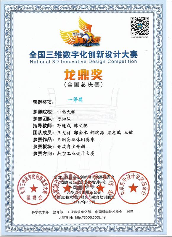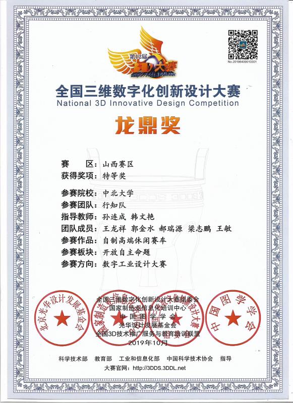 代表中北大学参赛的行知队(团队成员:王龙祥、郭金水、郝瑞源、梁志鹏、王敏,指导老师:孙连成、韩文艳),一路过关斩将,在山西省3D大赛荣获特等奖并进军全国总决赛,最终获得全国总决赛一等奖。