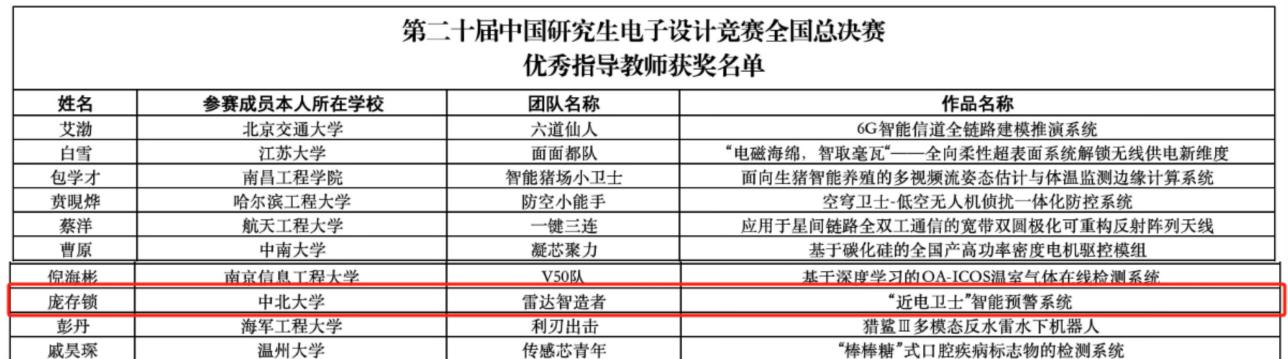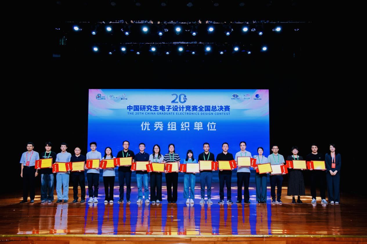 2025年8月14日-17日,“兆易创新杯”第二十届中国研究生电子设计竞赛全国总决赛(以下简称“研电赛”)在深圳信息职业技术大学顺利举行,来自全国各地的635支队伍,经过作品展示及答辩角逐出最终的国家级奖项。我校在总决赛中共获得全国商业计划书一等奖1项、二等奖1项、技术竞赛二等奖3项、企业命题三等奖1项的良好成绩,同时我校庞存锁老师获得优秀指导教师,学校荣获“优秀组织奖”。
