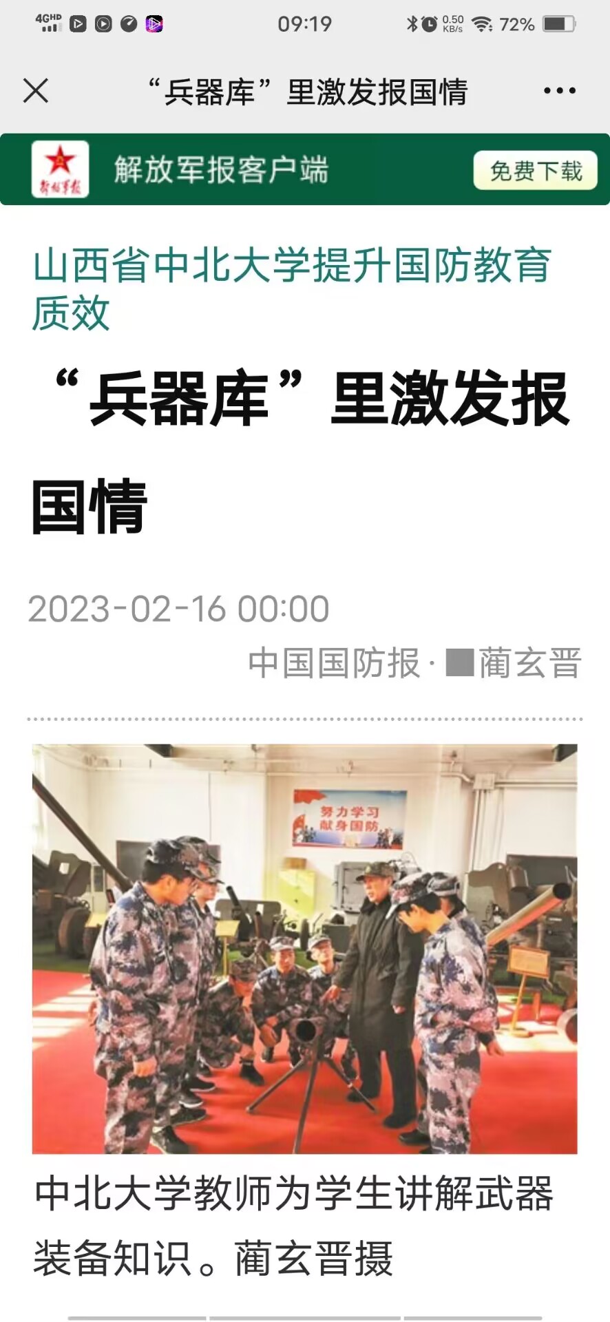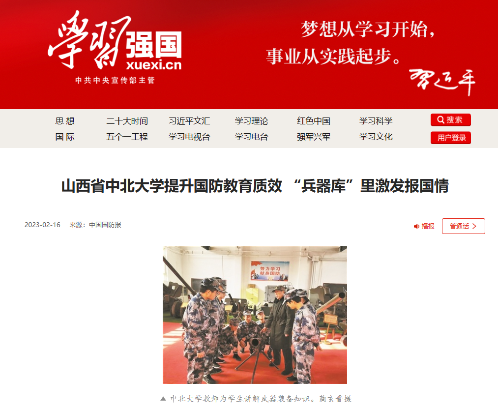 中北大学党委副书记雷锋斌告诉笔者,学校的前身是我党我军1941年在太行山上建立的第一所兵工学校——太行工业学校。近年来,学校着眼国防和军队现代化建设需要,挖掘自身优势,推动国防教育创新发展。他们浓厚校园国防文化氛围,建起军工文化园、国防人物雕塑群、国防文化长廊、兵器装备陈列室、“红色太行”国防教育主题网站等,构建“国防军工文化课+国防理论通识课+国防军事训练课+国防创新实践课+国防特色专业课”五位一体、28门课程组成的国防特色课程群,不断培固学生投身军工、献身国防的思想根基。