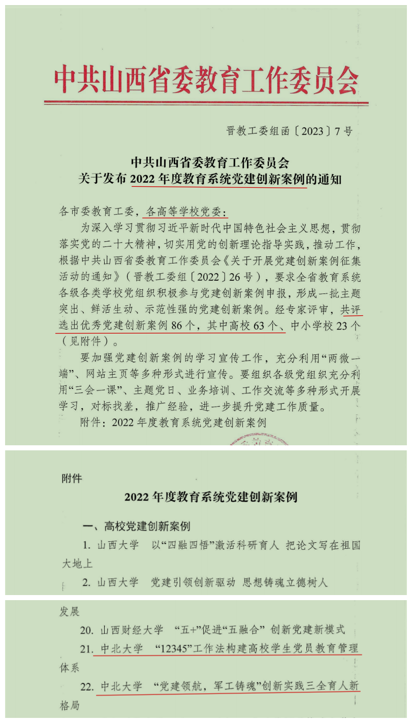 近日,山西省2022年度教育系统党建创新案例评选结果正式公布。我校机电工程学院教工第三党支部申报的“‘党建领航,军工铸魂’,创新实践三全育人新格局”和能源与动力工程学院党委申报的“‘12345’工作法构建高校学生党员教育管理体系”2个案例入选全省高校党建创新案例。