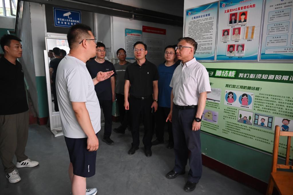 视察中,陈钱深入宿舍楼宇内部,逐项检查了宿舍结构布局、家具配备、水电设施、消防安全及公共区域环境等关键环节,详细询问项目施工进度、工程质量验收标准及卫生清洁等筹备细节,并认真听取相关部门关于新生入住安排、后勤服务保障等工作的汇报。