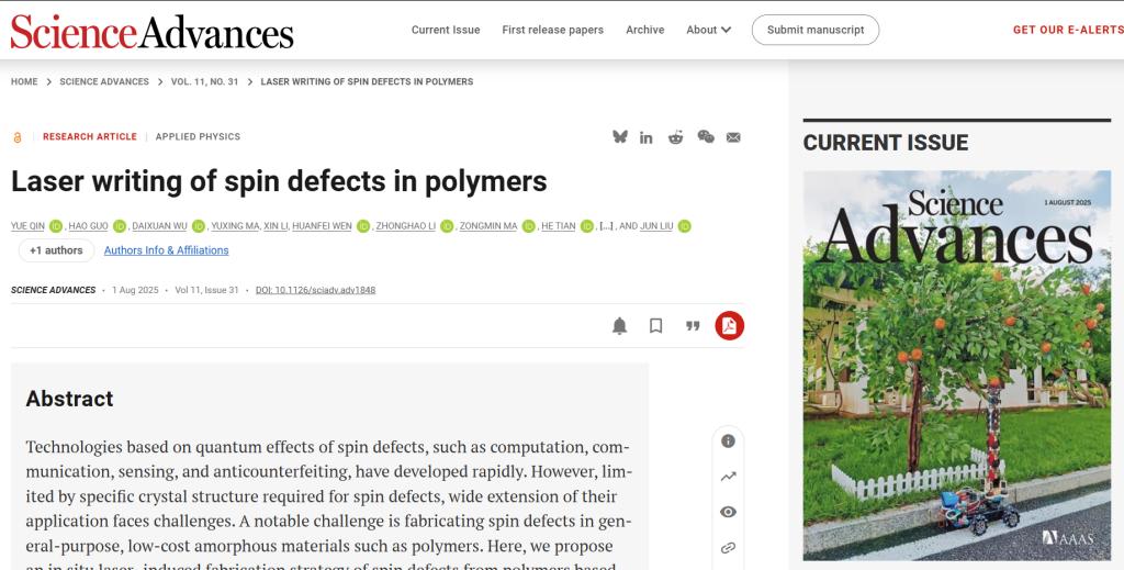 在量子功能结构制造方面,揭示了聚合物分子合成碳化硅自旋晶体结构的分子动力学过程,提出了光-气-电协同调控分子/原子选择性交联制造自旋结构机制,在各类聚合物中均实现了量子自旋结构原位制造,并进行了传感和加密功能验证,为量子器件、量子网络节点、量子计算载体等量子技术在柔性基材、橡胶制品等基础民生用品中普适化应用拉开序幕(Science Advances, 2025, 11:eadv1848,一作:秦岳博士、郭浩,通讯作者:刘俊、唐军等)。