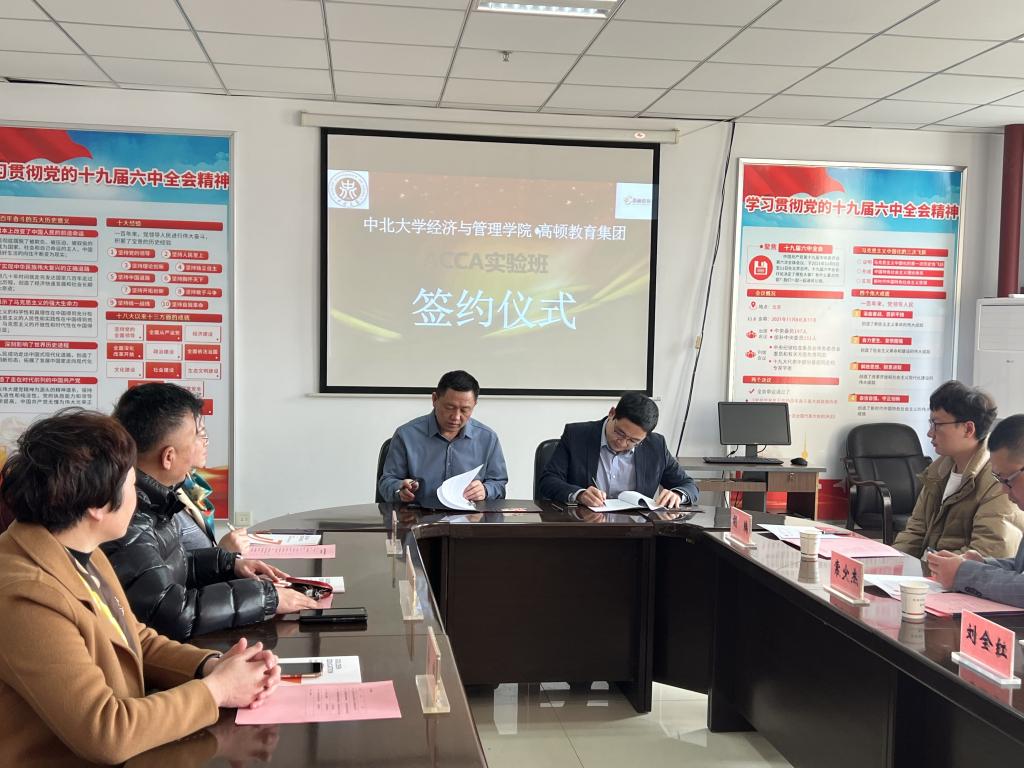 2023年2月23日,在院308会议室,经济与管理学院与高顿教育集团举办了校企合作人才培养签约仪式,高顿教育集团高校事业部西部大区总监李昌鑫、高校事业部西北区高校合作负责人刘全红、高校事业部西北区运营主管赵丽及太原分校相关负责人;经济与管理学院党委书记王琳、院长赵公民、副书记屈有明、管理系系主任李彦华、副主任吕微及财务管理专业教师代表出席了本次签约仪式。