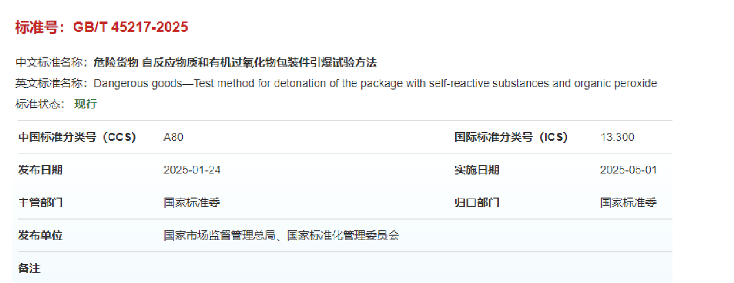 2025年5月,国家标准(编号:GB/T 45217-2025)《危险货物自反应物质和有机过氧化物包装件引爆试验方法》正式批准发布。该标准于2022年下达了标准制定计划(计划号为20221514-T-469),由我院安全科学与工程学科曹卫国教授团队牵头,联合南京理工大学、安徽理工大学等多家高校以及应急管理部化学品登记中心等行业优势单位历时2年多完成。标准引领,赋能安全科学与工程学科在危险化学品产业高质量发展,助力我校“双一流”建设。该成果是我校安全学科成立40年来牵头起草的首个“GB开头”国家标准,也是我校近8年唯一1项牵头起草的国家标准。
