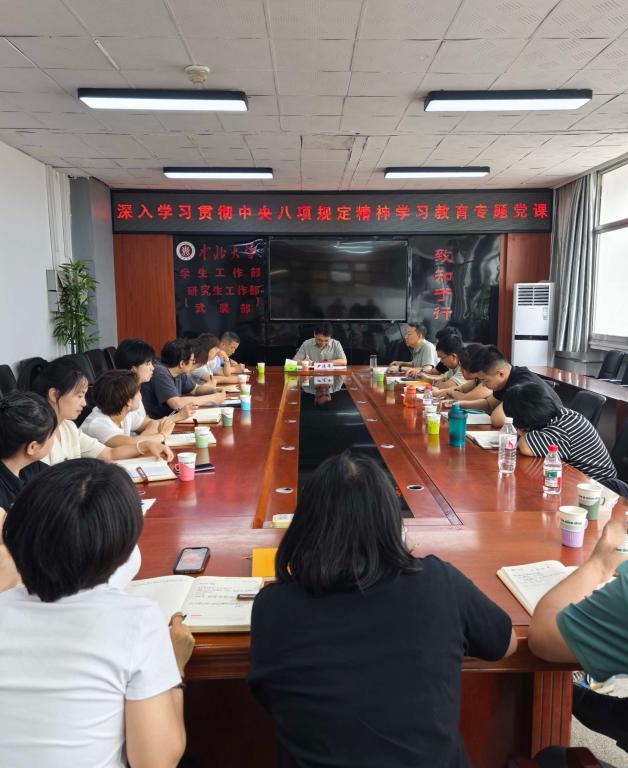 为深入贯彻中央八项规定精神学习教育,锤炼干部党性修养,提高思想觉悟,6月23日上午,学生工作部(人民武装部)党支部和校团委党支部在德怀楼211会议室开展学习教育,校党委常委、副校长尹建平以“深入贯彻八项规定精神,筑牢学生工作廉洁防线”为题讲授专题党课。