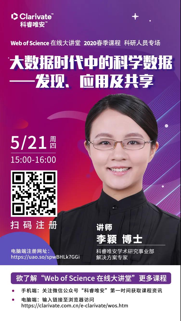 5月21日(周四)15:00 -16:00,Web of Science 2020春季课程—科研人员专场,第二十课“大数据时代中的科学数据——发现、应用及共享” 来了。