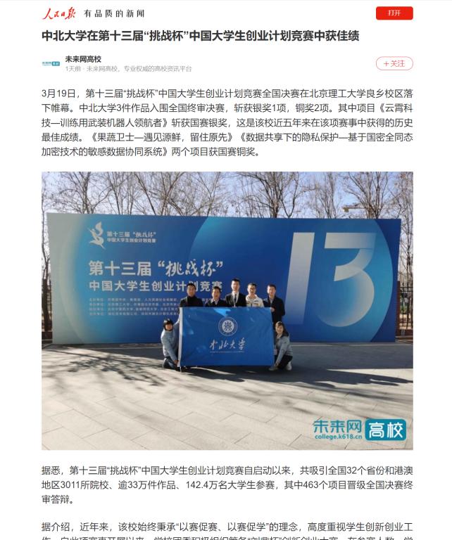 3月19日,第十三届“挑战杯”中国大学生创业计划竞赛全国决赛在北京理工大学良乡校区落下帷幕。中北大学3件作品入围全国终审决赛,斩获银奖1项,铜奖2项。其中项目《云霄科技—训练用武装机器人领航者》斩获国赛银奖,这是该校近五年来在该项赛事中获得的历史最佳成绩。《果蔬卫士—遇见源鲜,留住原先》《数据共享下的隐私保护—基于国密全同态加密技术的敏感数据协同系统》两个项目获国赛铜奖。
