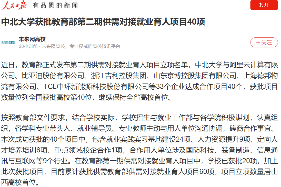 近日,教育部正式发布第二期供需对接就业育人项目立项名单,中北大学与阿里云计算有限公司、比亚迪股份有限公司、浙江吉利控股集团、山东京博控股集团有限公司、上海德邦物流有限公司、TCL中环新能源科技股份有限公司等33个企业达成合作项目40个,获批项目数量位列全国获批高校第40位,继续保持全省高校首位。