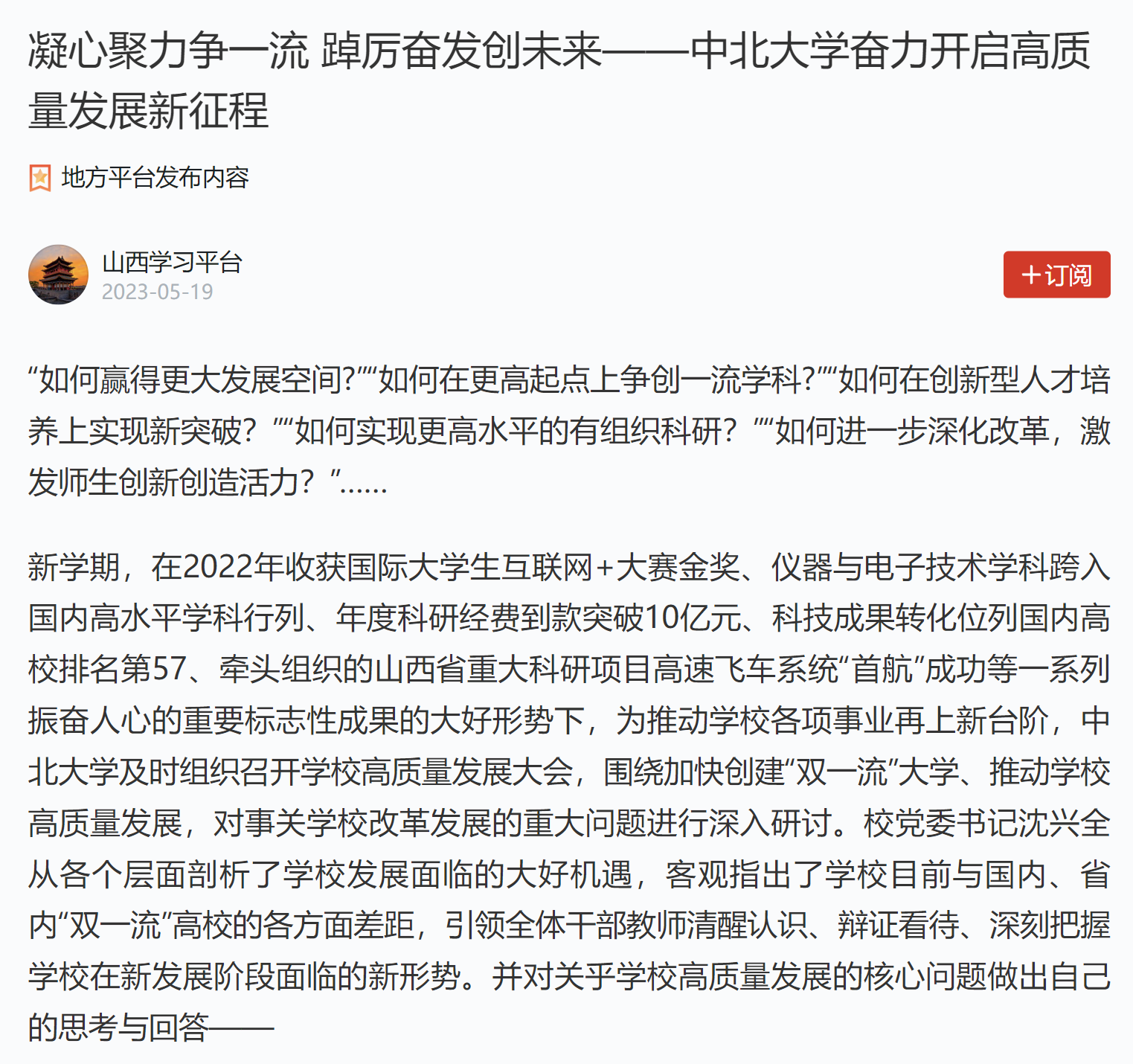 新学期,在2022年收获国际大学生互联网+大赛金奖、仪器与电子技术学科跨入国内高水平学科行列、年度科研经费到款突破10亿元、科技成果转化位列国内高校排名第57、牵头组织的山西省重大科研项目高速飞车系统“首航”成功等一系列振奋人心的重要标志性成果的大好形势下,为推动学校各项事业再上新台阶,中北大学及时组织召开学校高质量发展大会,围绕加快创建“双一流”大学、推动学校高质量发展,对事关学校改革发展的重大问题进行深入研讨。校党委书记沈兴全从各个层面剖析了学校发展面临的大好机遇,客观指出了学校目前与国内、省内“双一流”高校的各方面差距,引领全体干部教师清醒认识、辩证看待、深刻把握学校在新发展阶段面临的新形势。并对关乎学校高质量发展的核心问题做出自己的思考与回答——