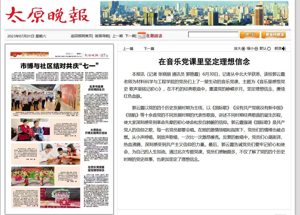 6月30日,记者从中北大学获悉,该校郭云霞老师为材料科学与工程学院的党员们上了一堂生动的音乐党课,主题为《音乐里感悟党史 歌声里铭记初心》,在不朽的经典歌曲中,重温党的峥嵘岁月,坚定理想信念,赓续红色血脉。