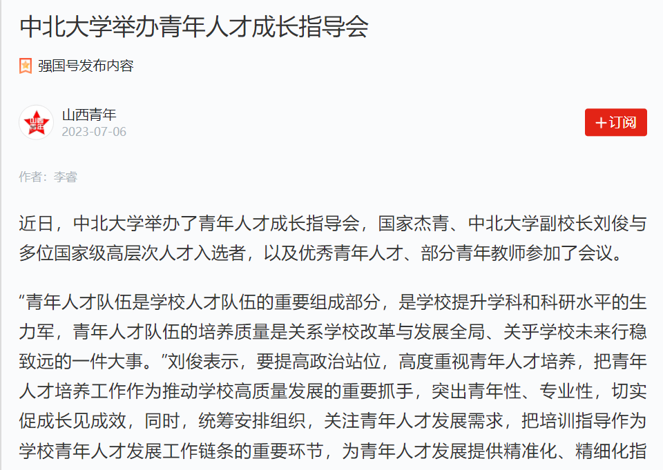 近日,中北大学举办了青年人才成长指导会,国家杰青、中北大学副校长刘俊与多位国家级高层次人才入选者,以及优秀青年人才、部分青年教师参加了会议。