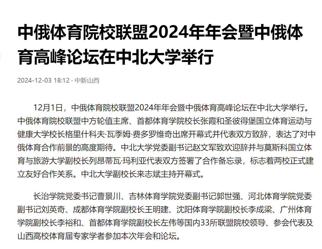 12月1日,中俄体育院校联盟2024年年会暨中俄体育高峰论坛在中北大学举行。中俄体育院校联盟中方轮值主席、首都体育学院校长张霞和圣彼得堡国立体育运动与健康大学校长格里什科夫·瓦季姆·费多罗维奇出席开幕式并代表双方致辞,表达了对中俄体育合作前景的高度期待。中北大学党委副书记赵文军致欢迎辞并与莫斯科国立体育与旅游大学副校长列昂蒂瓦·玛利亚代表双方签署了合作备忘录,标志着两校正式建立友好合作关系。中北大学副校长来志斌主持开幕式。