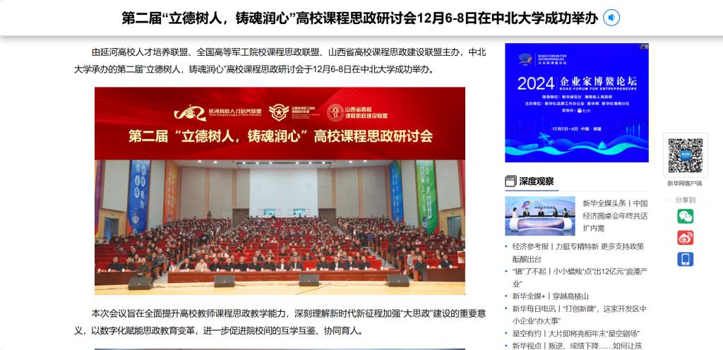 由延河高校人才培养联盟、全国高等军工院校课程思政联盟、山西省高校课程思政建设联盟主办,中北大学承办的第二届“立德树人,铸魂润心”高校课程思政研讨会于12月6-8日在中北大学成功举办。