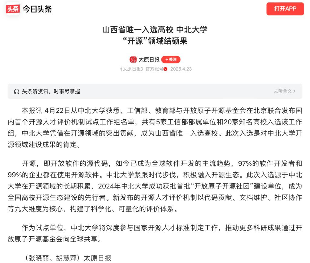 作为试点单位,中北大学将深度参与国家开源人才标准制定工作,推动更多科研成果通过开放原子开源基金会向全球共享。
