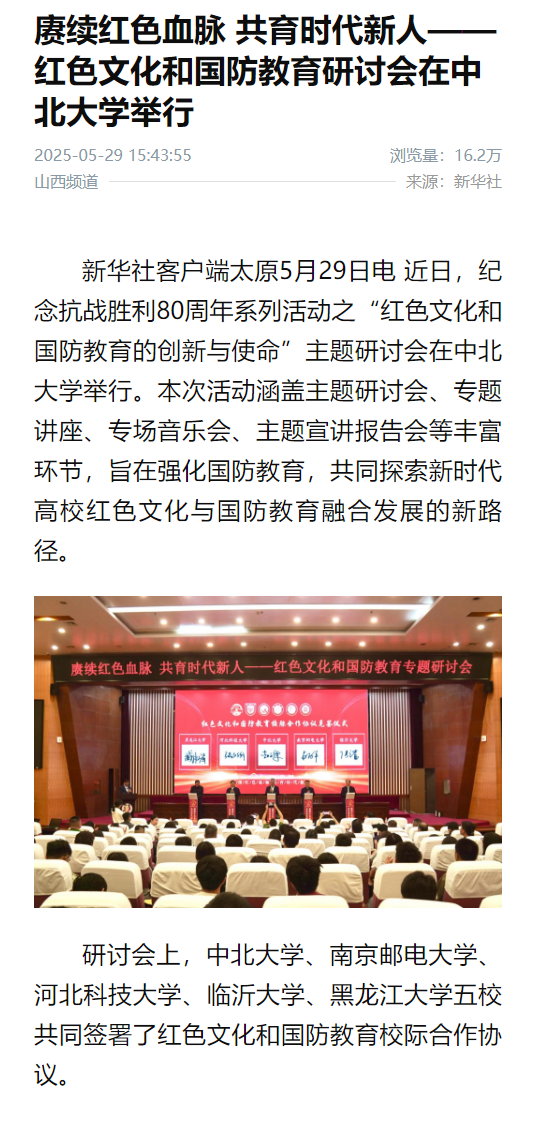 新华社客户端太原5月29日电 近日,纪念抗战胜利80周年系列活动之“红色文化和国防教育的创新与使命”主题研讨会在中北大学举行。本次活动涵盖主题研讨会、专题讲座、专场音乐会、主题宣讲报告会等丰富环节,旨在强化国防教育,共同探索新时代高校红色文化与国防教育融合发展的新路径。