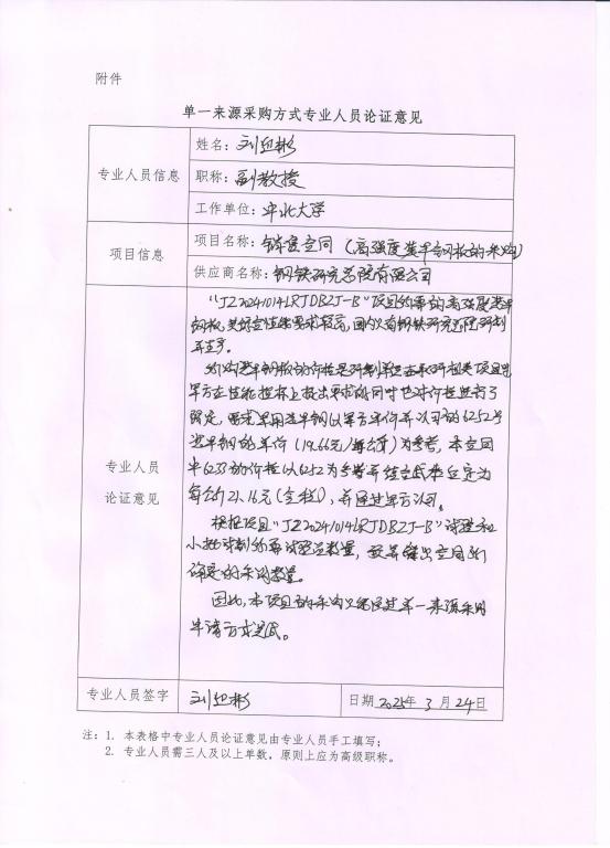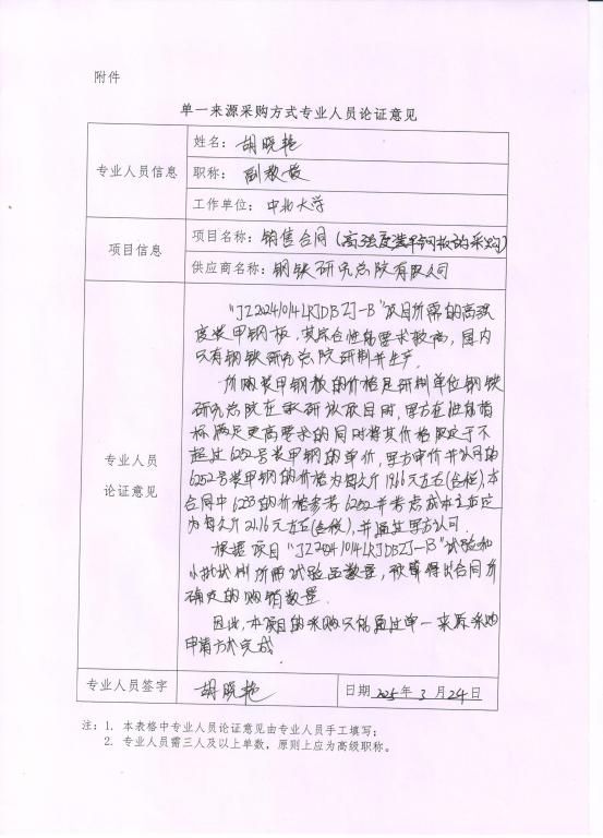 采用单一来源采购方式的原因及说明:“JZ20241014LRJDBZJ-B”项目所需的高强度装甲钢板,国内只有钢铁研究总院研制并生产。相关货物的单价均通过军方审价确定,数量和型号由源项目的实际需要确定,没有其他单位可供选择,只能选择单一来源采购方式。