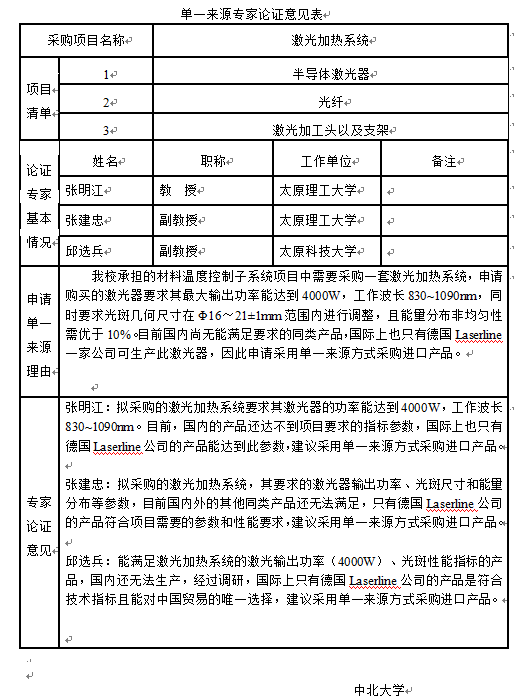 激光加热系统是根据中北大学承担的材料温度控制子系统项目中甲方的实际需求定制的一套用于材料高温加热的系统。本项目周期三个月,需要在规定的时间内完成激光器、激光加工头等其他器件的采购,搭建高温测试系统平台,并进行测试反馈。与甲方进行项目论证过程中,针对激光加热子系统中激光器的参数进行了充分的论证,已定方案中激光器参数满足系统要求。要求申购的激光器最大输出功率4000W,工作波长830~1090nm,功率不稳定度2%,光斑几何尺寸可在Φ16~21±1mm范围内进行调整,且光斑的能量分布非均匀性须优于10%。目前国内尚无能满足上述参数要求的同类产品,国际上也只有德国Laserline一家公司可生产此激光器,因此只能采用单一来源方式采购进口产品。