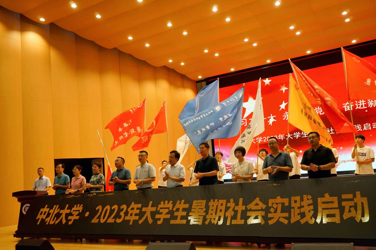 与会领导为即将出征的实践团队代表授旗,正式启动我校2023年大学生暑期社会实践活动。