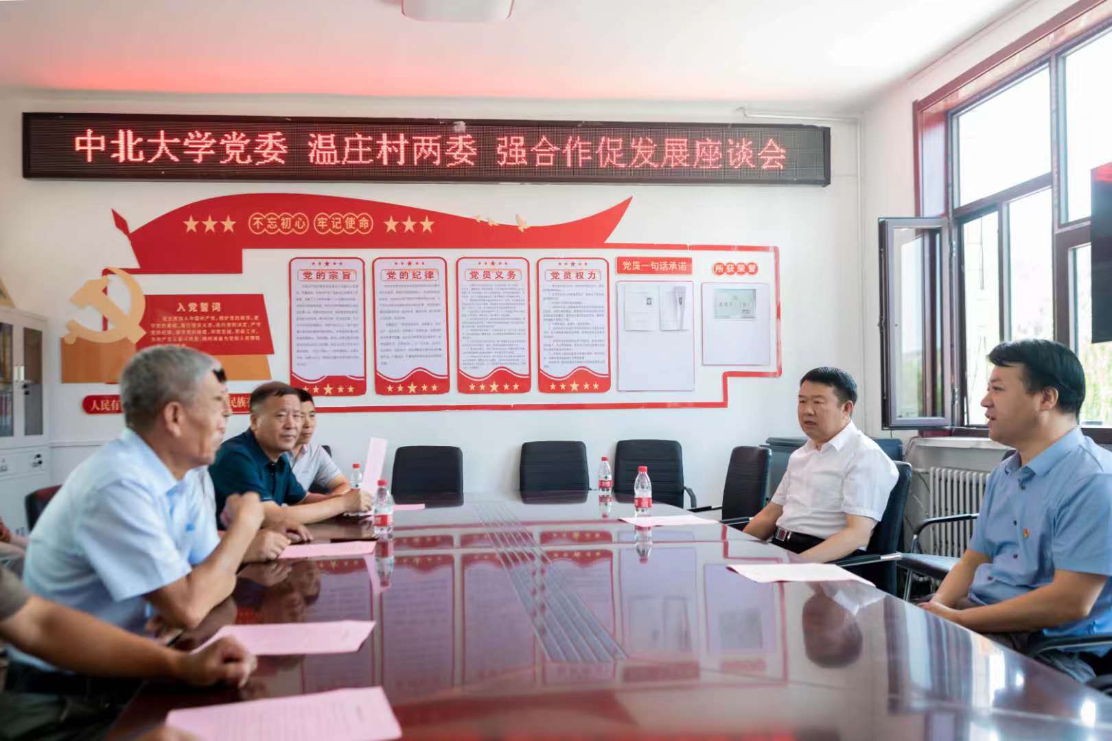 7月18日上午,沈兴全与武乡县温庄村两委进行座谈交流。沈兴全表示学校将积极对接各方资源,助力温庄红色旅游资源的开发,进一步促进温庄村经济发展。会后,沈兴全带队参观了我校前身——太行工业学校旧址,并集体重温了入党誓词。全体领导干部高举右拳、庄严宣誓,铿锵坚定的声音久久回荡,大家在重温入党誓词中检视自身、激昂斗志。