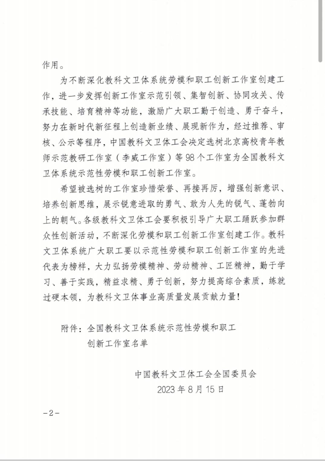 近日,我校马铁华劳模创新工作室被确立为全国教科文卫体系统示范性劳模和职工创新工作室。此次全委共选树了98个创新工作室,我省三所高校的,三个劳模创新工作室入选。