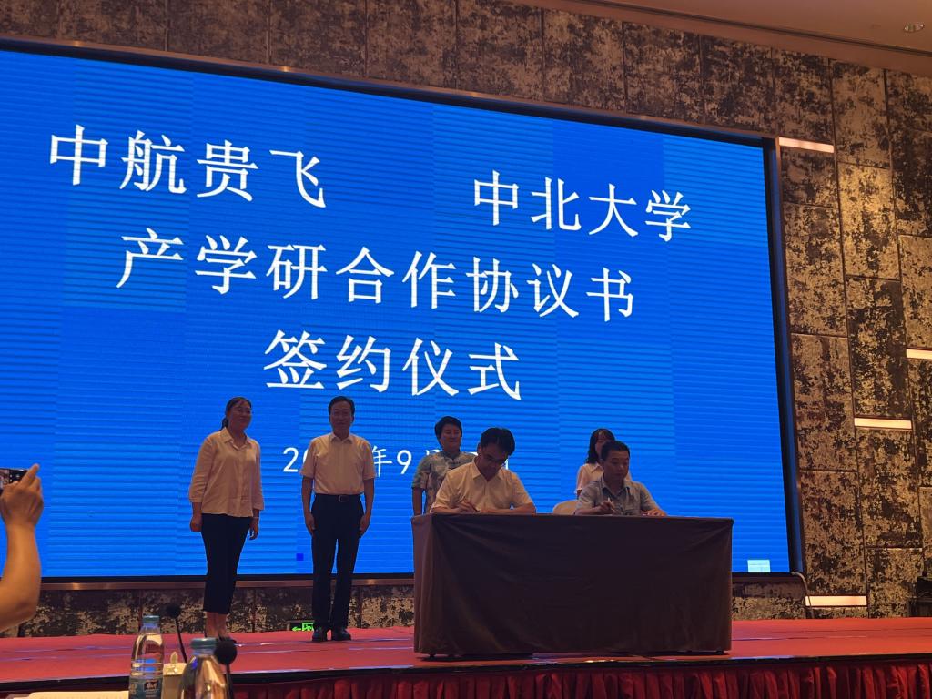 尹建平与中航贵飞党委副书记周大尧代表校企双方签订了《中航贵飞—中北大学产学研合作协议》。