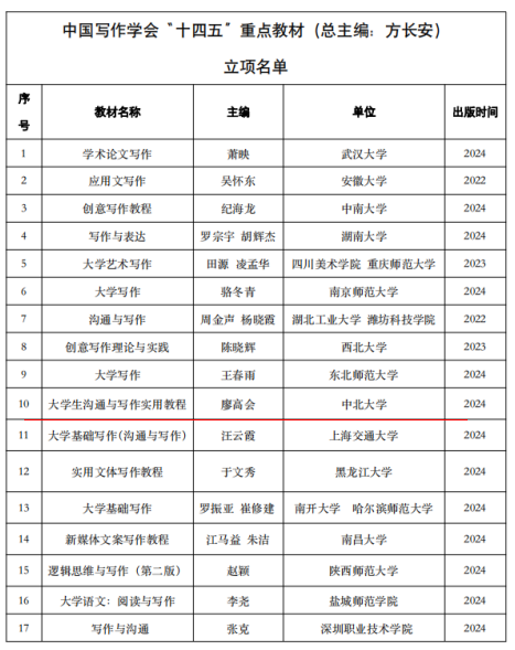 我校通识教育中心《写作与沟通》教材 入选中国写作协会“十四五”重点教材