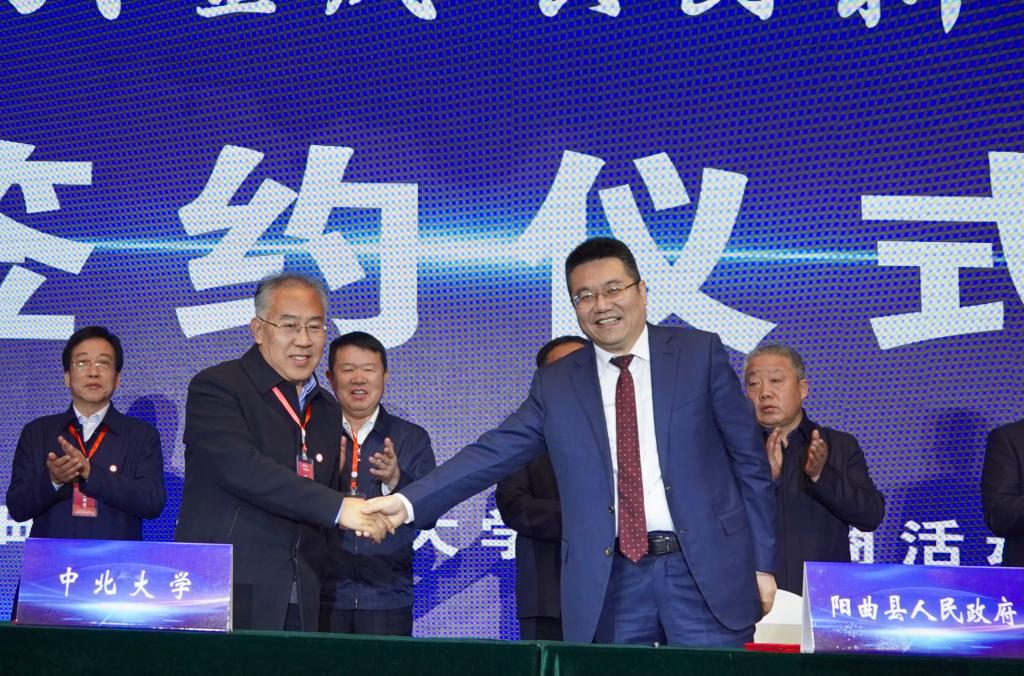 副校长苏铁熊介绍了中北大学科技创新基地〔晋创谷(阳曲)〕的规划,并代表学校与阳曲县签署了县校合作“12大基地”框架协议和县校战略合作协议。