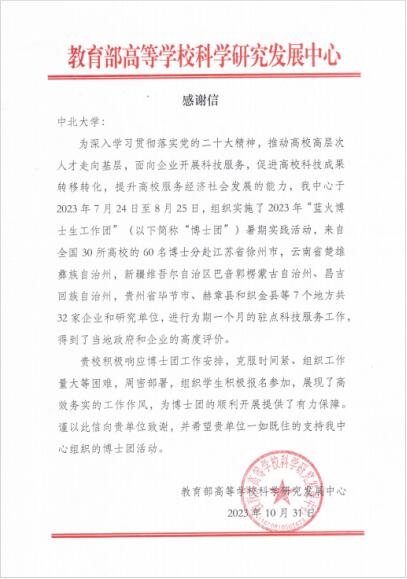 为“蓝火计划”博士生工作团提供有力支持 教育部高校科学研究发展中心给我校发来感谢信