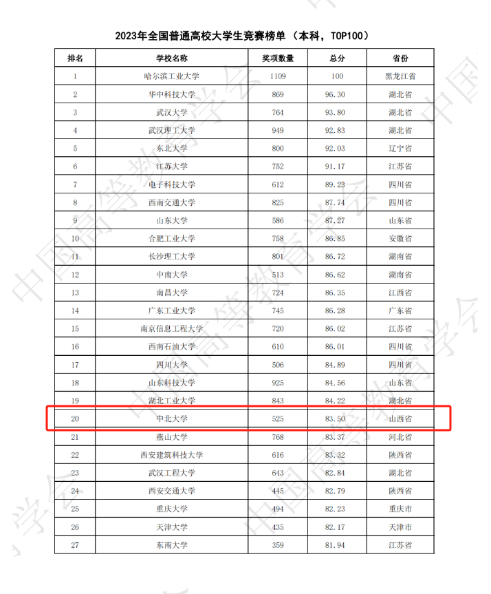 3月22日,教育部中国高等教育学会发布全国普通高校大学生竞赛第八轮榜单,我校表现出色,以奖项数量525项、总分83.5分的优异成绩在2023年全国普通高校大学生竞赛榜单(本科,TOP100)中位列全国第20位、山西省首位;在2019-2023年全国普通高校大学生竞赛榜单(本科,TOP300)位列全国第36位。