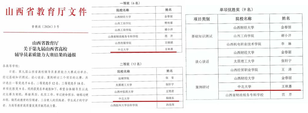 近日,由山西省教育厅主办的“第九届山西省高校辅导员素质能力大赛”在太原理工大学明向校区落下帷幕。比赛分为基础知识测试、案例研讨和谈心谈话三个环节。经过激烈角逐,我校信息与通信工程学院辅导员王秋惠、计算机科学与技术学院辅导员杨晓东在全省76名选手中脱颖而出,分别获得一等奖、二等奖,王秋惠在案例研讨环节获单项优胜奖。