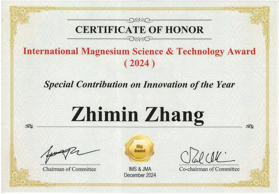 我校张治民教授荣获国际镁学会“2024年度特别创新贡献奖”