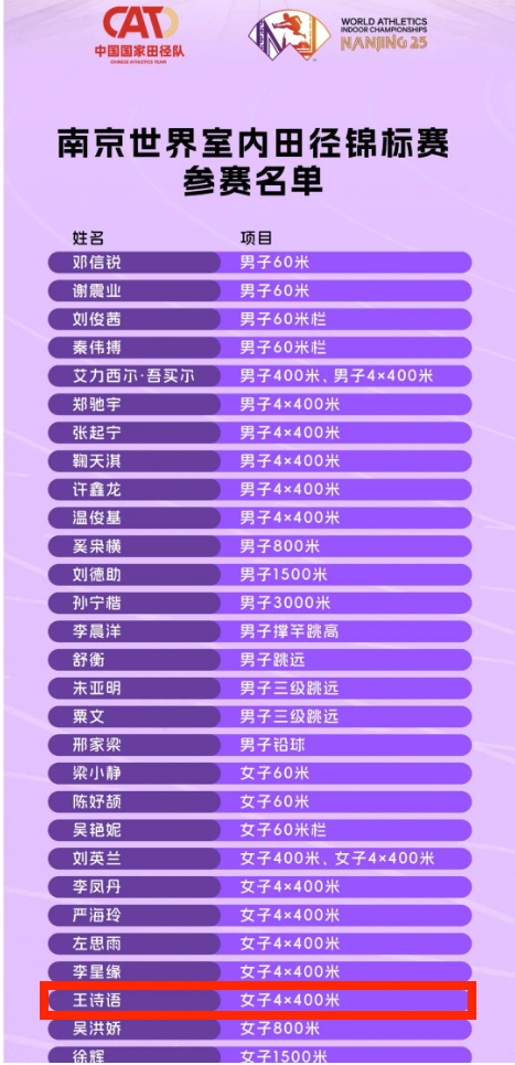 在女子400米决赛中,王诗语同学继续保持高水平的竞技状态,以55秒34的优异成绩获得铜牌,成功入选南京世界田联室内田径锦标赛女子4×400米项目参赛名单。