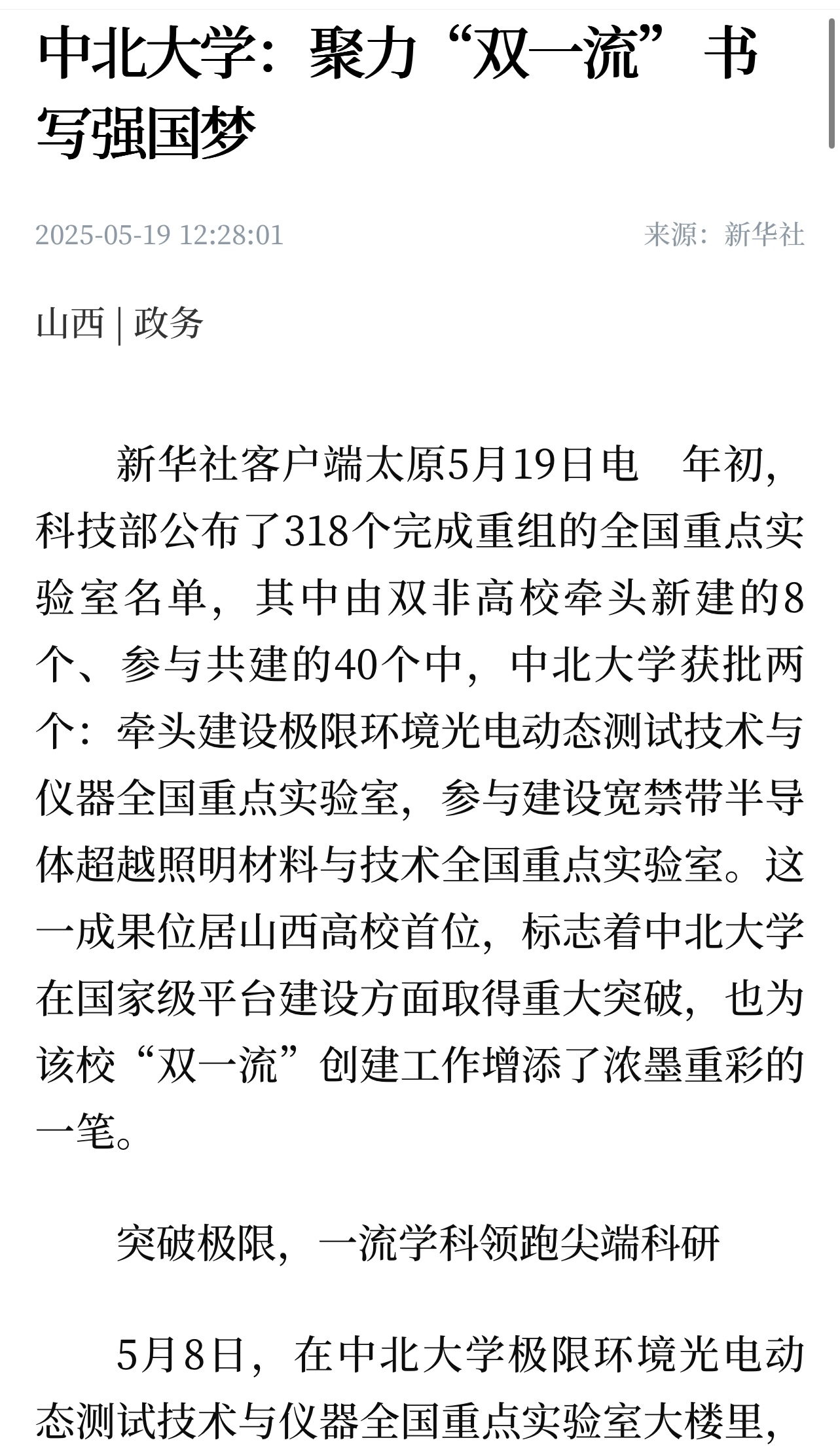 5月19日是我校建校84周年校庆日,新华社、山西日报头版以“中北大学: 聚力双一流 书写强国梦”为题,突出报道我校重要办学成果。原文如下: