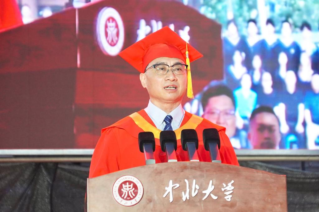 今年我校共有8620名本科生、2006名硕士研究生、68名博士研究生圆满完成学业。校长陈钱以《奔赴人生旷野 书写精彩华章》为题致辞,向圆满完成学业、即将踏上人生新征程的毕业生表示祝贺。他指出,全校学子的奋斗青春始终与时代的脉搏同频共振,与学校高质量发展紧密相连。现如今,中北大学正凭实力硬核一路向前,跑出“双一流”创建的加速度,全体学子都是亲历者、参与者,更是推动者和贡献者。在即将开启崭新篇章之际,陈钱校长以“奋进”“创新”“奉献”三个关键词为毕业生送上嘱托:一是勇担使命,做新时代的奋进者;二是锐意创新,做新时代的开拓者;三是心怀大我,做新时代的奉献者。他希望,作为“人民兵工第一校”的学子,要时刻弘扬“把一切献给党”的人民兵工精神,以“功成不必在我”的精神境界和“功成必定有我”的责任担当,勇做走在时代前列的奋进者、开拓者、奉献者,在强国建设、民族复兴伟业的征程中,彰显青春风采、贡献青春力量。