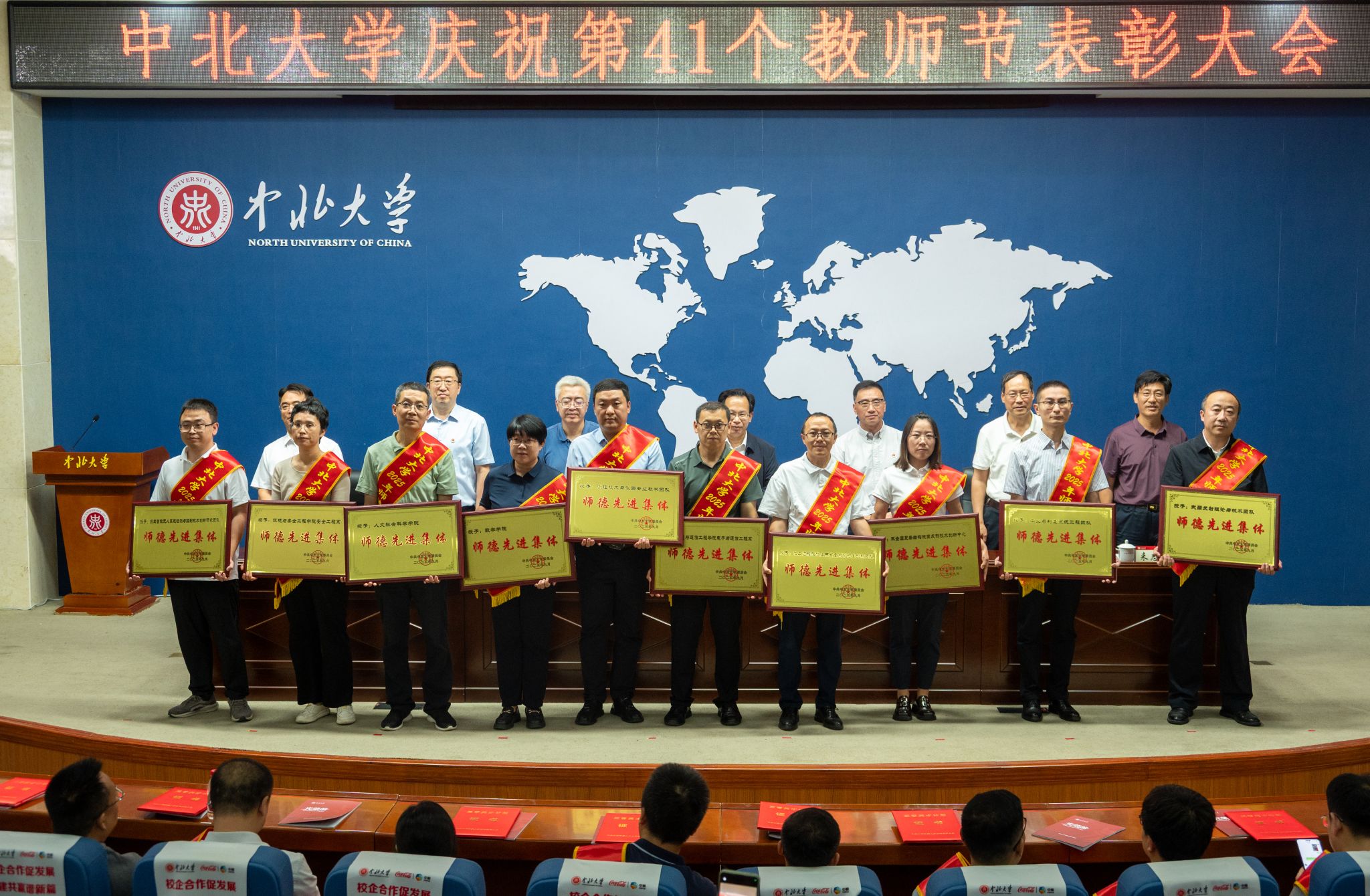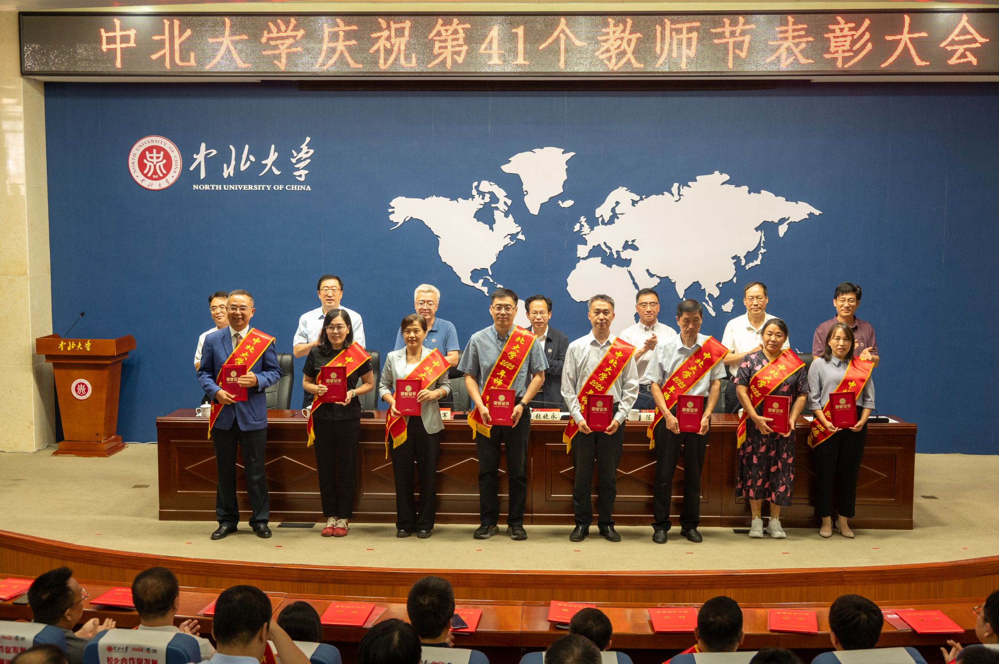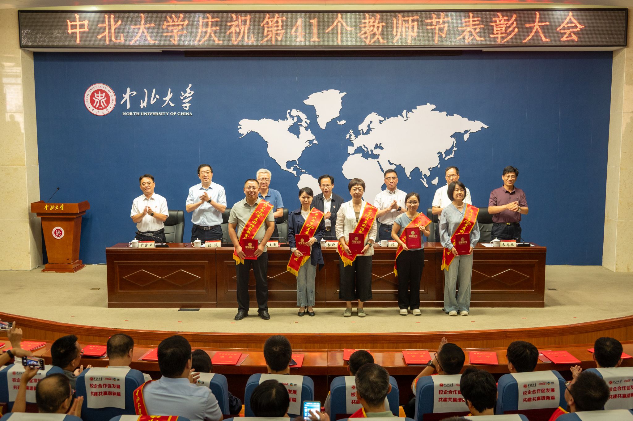 校领导赵文军、刘俊、来志斌分别宣读了《2024年度三晋英才计划入选名单》 《关于表彰2025年师德建设先进集体、师德标兵和师德先进个人的决定》 《关于表彰第十届“知行杯”我最喜爱的老师的决定》《关于表彰2025年“美利信奖教金”获得者的的决定》《关于表彰2024年中北大学本科教育教学审核评估先进集体、先进个人的决定》。武器发射理论与技术团队等10个团队获“师德建设先进集体”荣誉;杜文华等9位教师获“2025年师德标兵”荣誉;徐永杰等50位教师获“师德先进个人”荣誉;孔慧华等5名教师获“美利信奖教金”;王永文等10位教师获第十届“知行杯我最喜爱的老师”荣誉。会议同时对本科教育教学审核评估中11个集体、8个职能处室、77名先进个人进行表彰。主席台领导分别为获奖集体和个人代表颁奖。