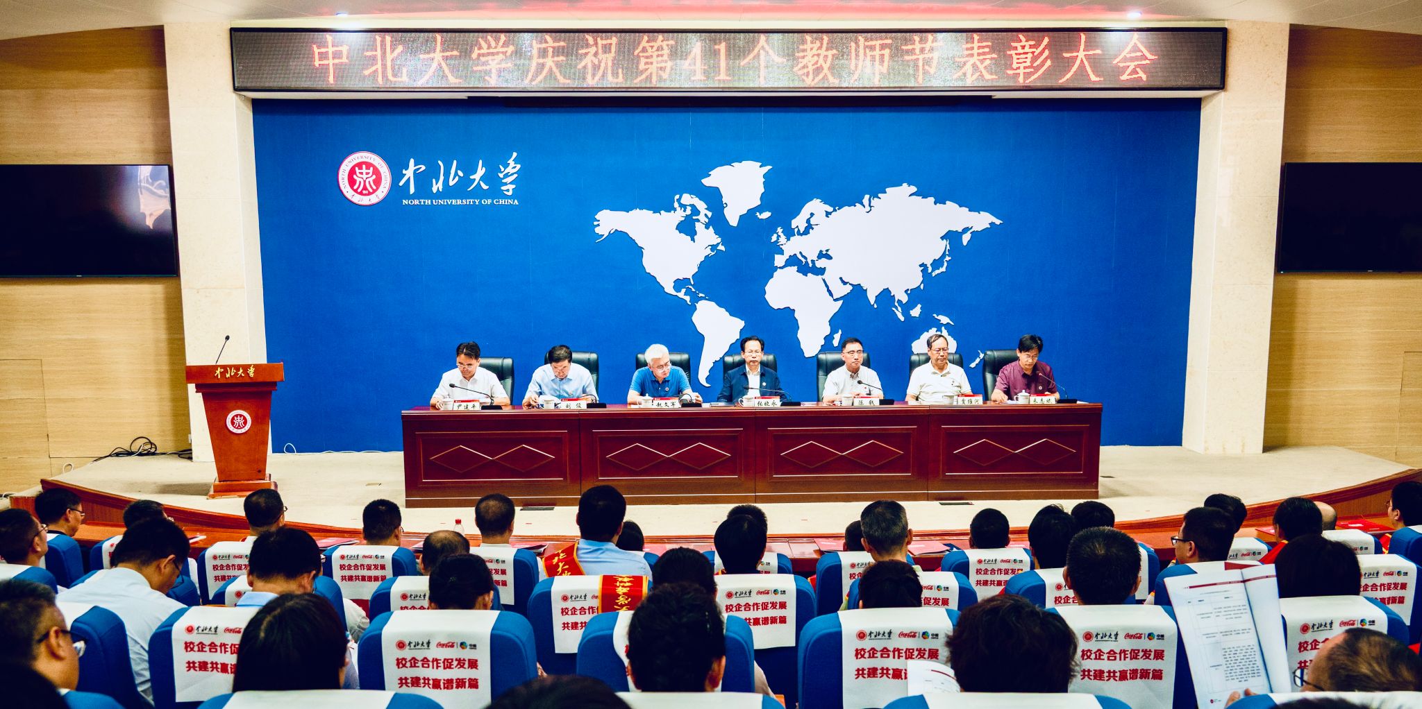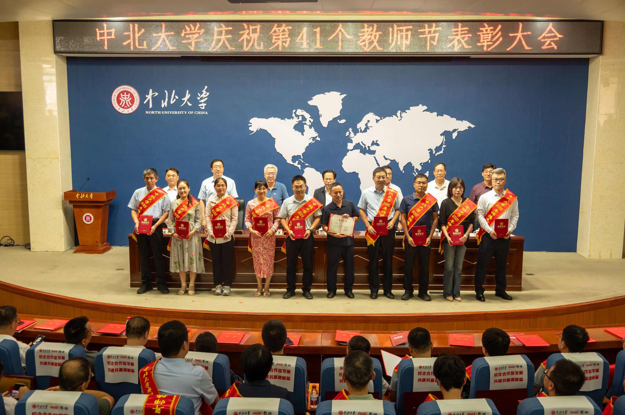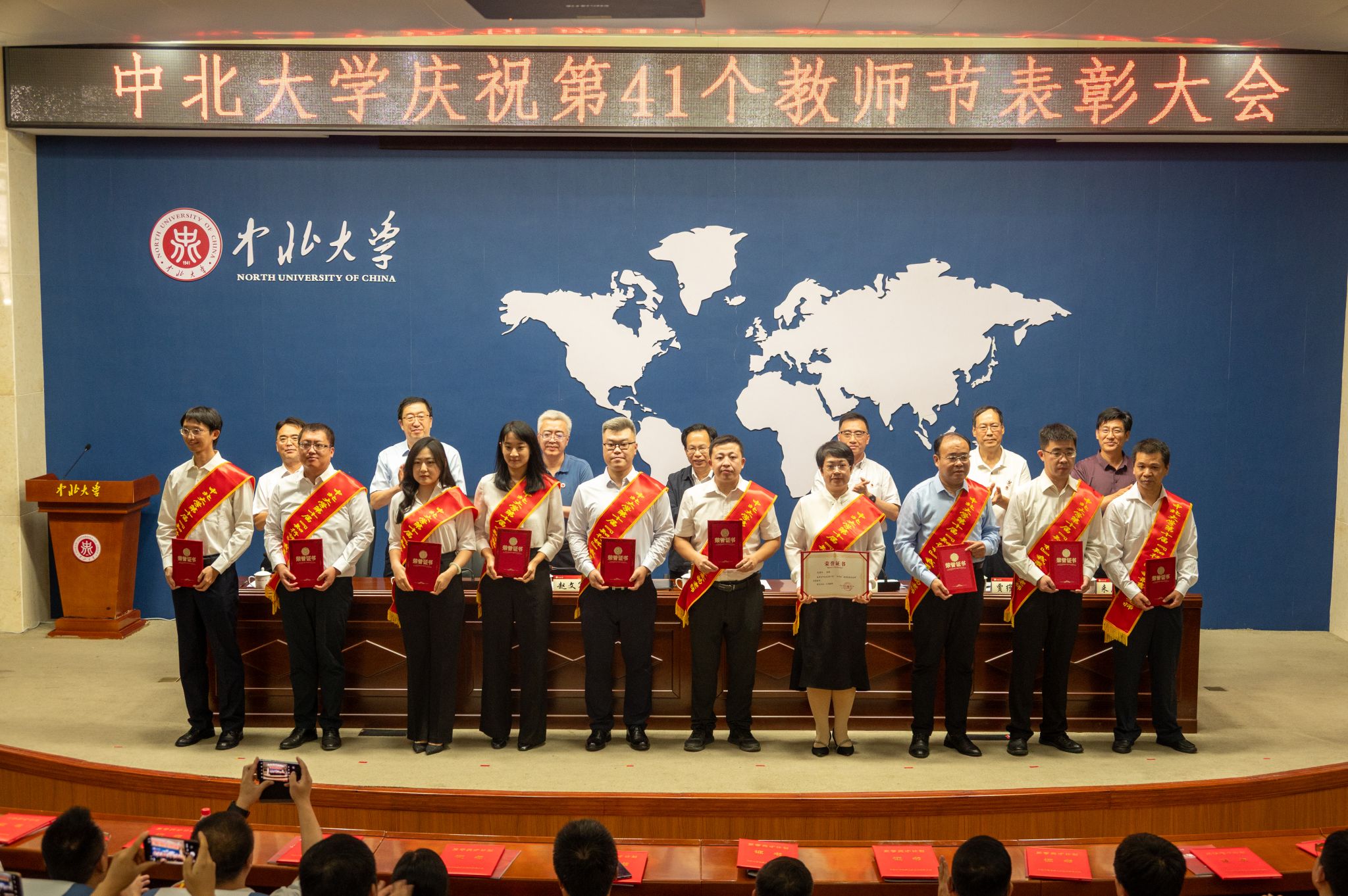 校领导赵文军、刘俊、来志斌分别宣读了《2024年度三晋英才计划入选名单》 《关于表彰2025年师德建设先进集体、师德标兵和师德先进个人的决定》 《关于表彰第十届“知行杯”我最喜爱的老师的决定》《关于表彰2025年“美利信奖教金”获得者的的决定》《关于表彰2024年中北大学本科教育教学审核评估先进集体、先进个人的决定》。武器发射理论与技术团队等10个团队获“师德建设先进集体”荣誉;杜文华等9位教师获“2025年师德标兵”荣誉;徐永杰等50位教师获“师德先进个人”荣誉;孔慧华等5名教师获“美利信奖教金”;王永文等10位教师获第十届“知行杯我最喜爱的老师”荣誉。会议同时对本科教育教学审核评估中11个集体、8个职能处室、77名先进个人进行表彰。主席台领导分别为获奖集体和个人代表颁奖。