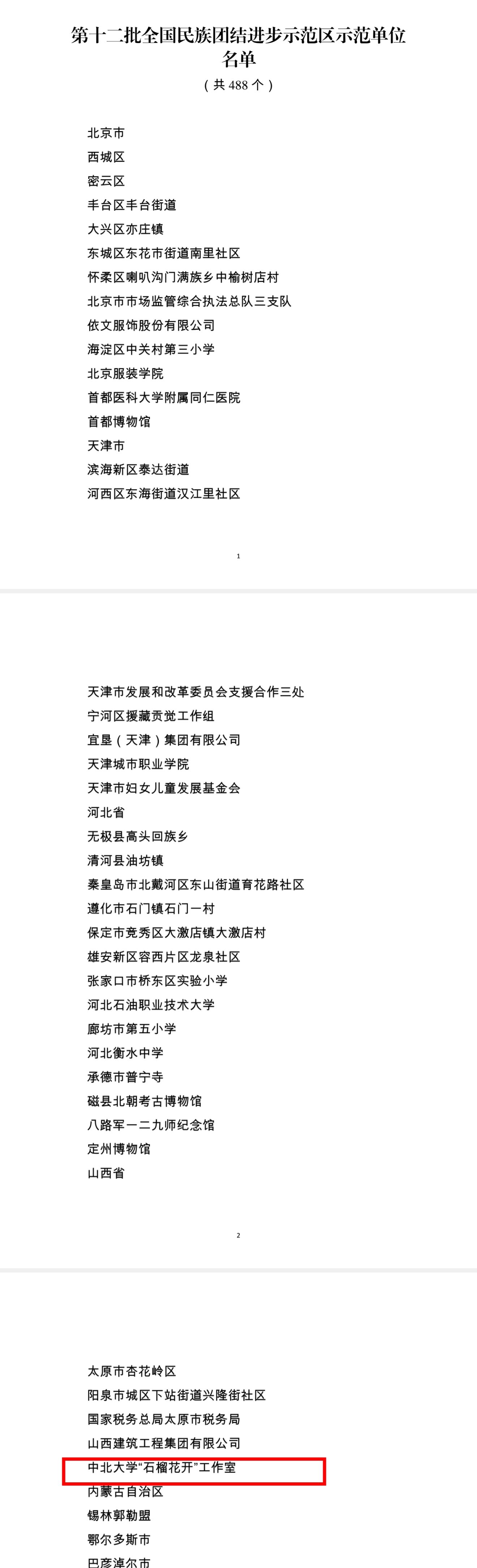 在1月29日召开的全国民委主任会议上,宣读了《国家民委关于命名第十二批全国民族团结进步示范区示范单位的决定》。我校人文社会科学学院加俊老师主持的中北大学“石榴花开”工作室成功入选第十二批全国民族团结进步示范单位,成为山西省入选“第十二批全国民族团结进步示范区示范单位的5个单位(地区)之一,也是全省教育系统唯一入选单位。
