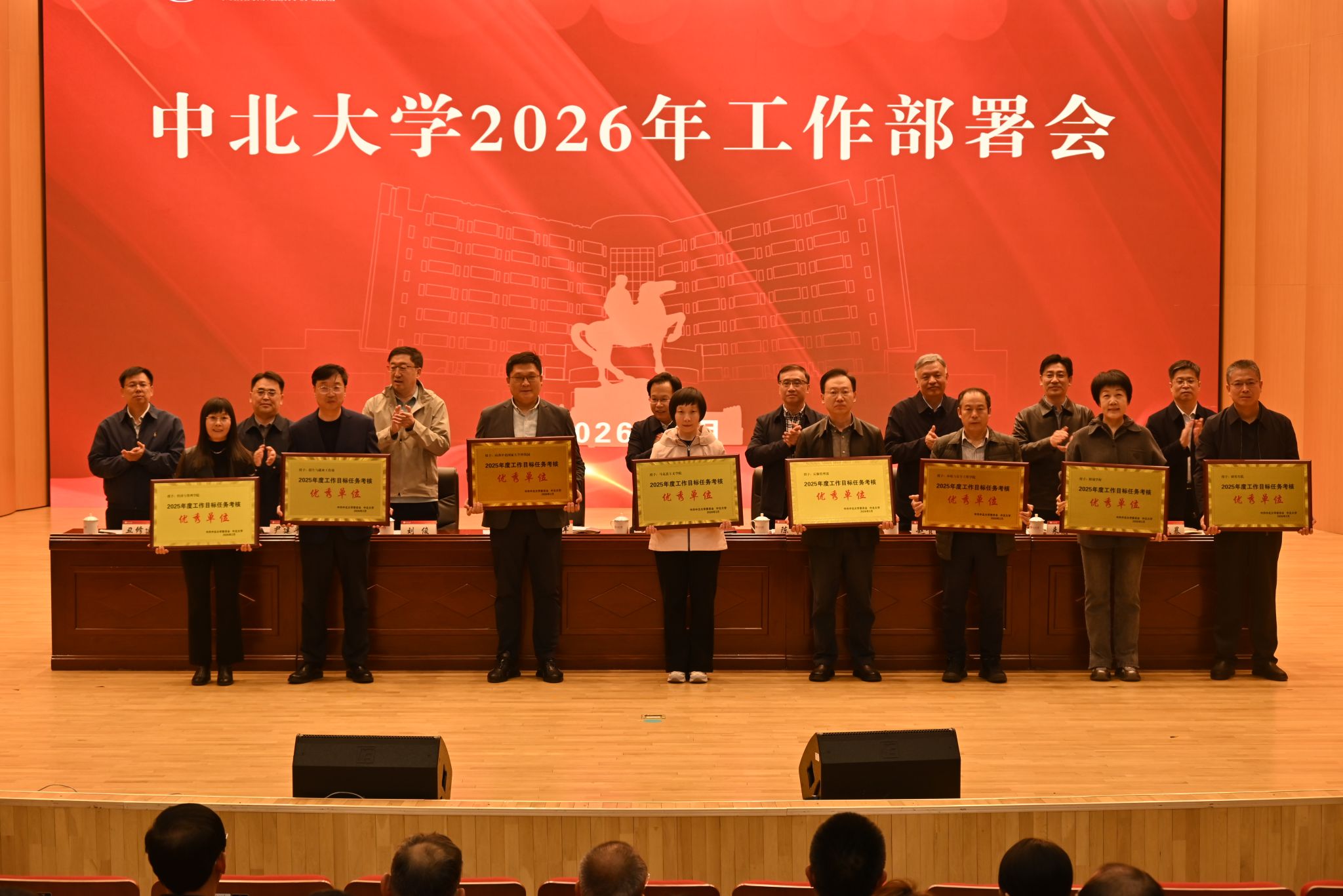 会议现场,全体校领导为2025年度工作目标任务考核优秀单位及2025年度工作目标创新与贡献奖单位颁奖,充分肯定各单位过去一年的工作成效。