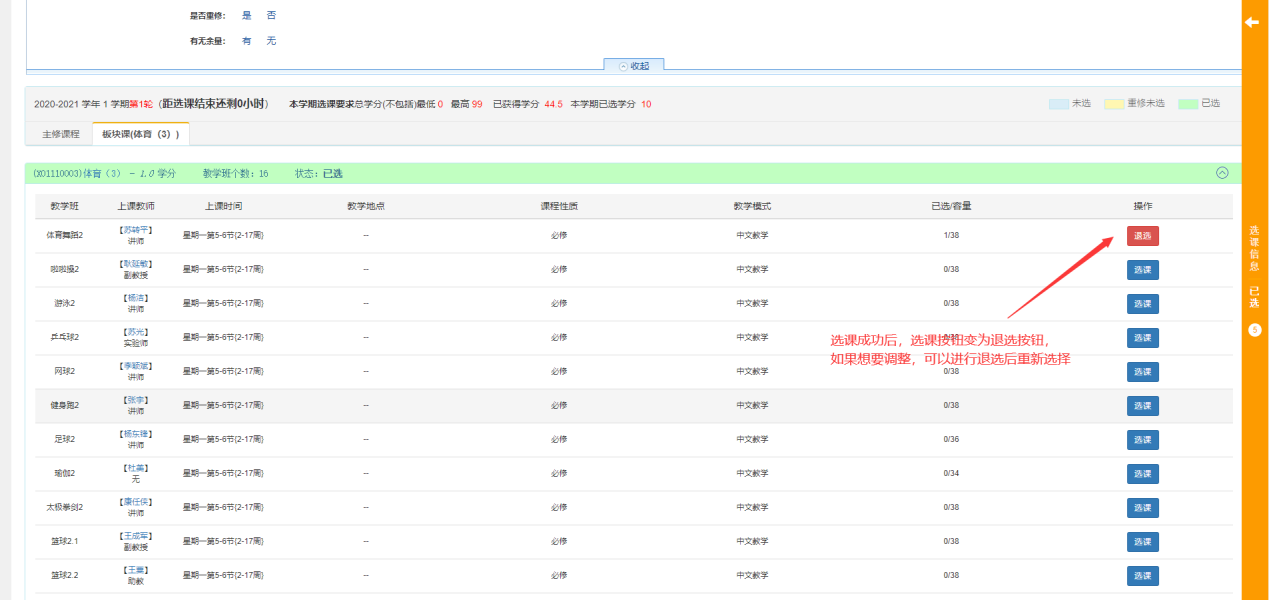 点击对应教学班后面的选课按钮进行选课,选课成功后选课按钮变为退选按钮,如需退选点击退选按钮。