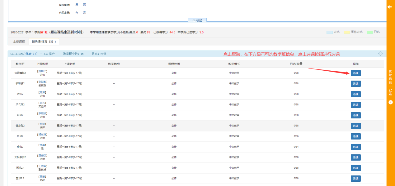 选课页面中选择主修课程或者板块课程:2022级2022体育、2023级2023体育、2024级2024体育,点击查询按钮,查询后下方显示可选的教学班。